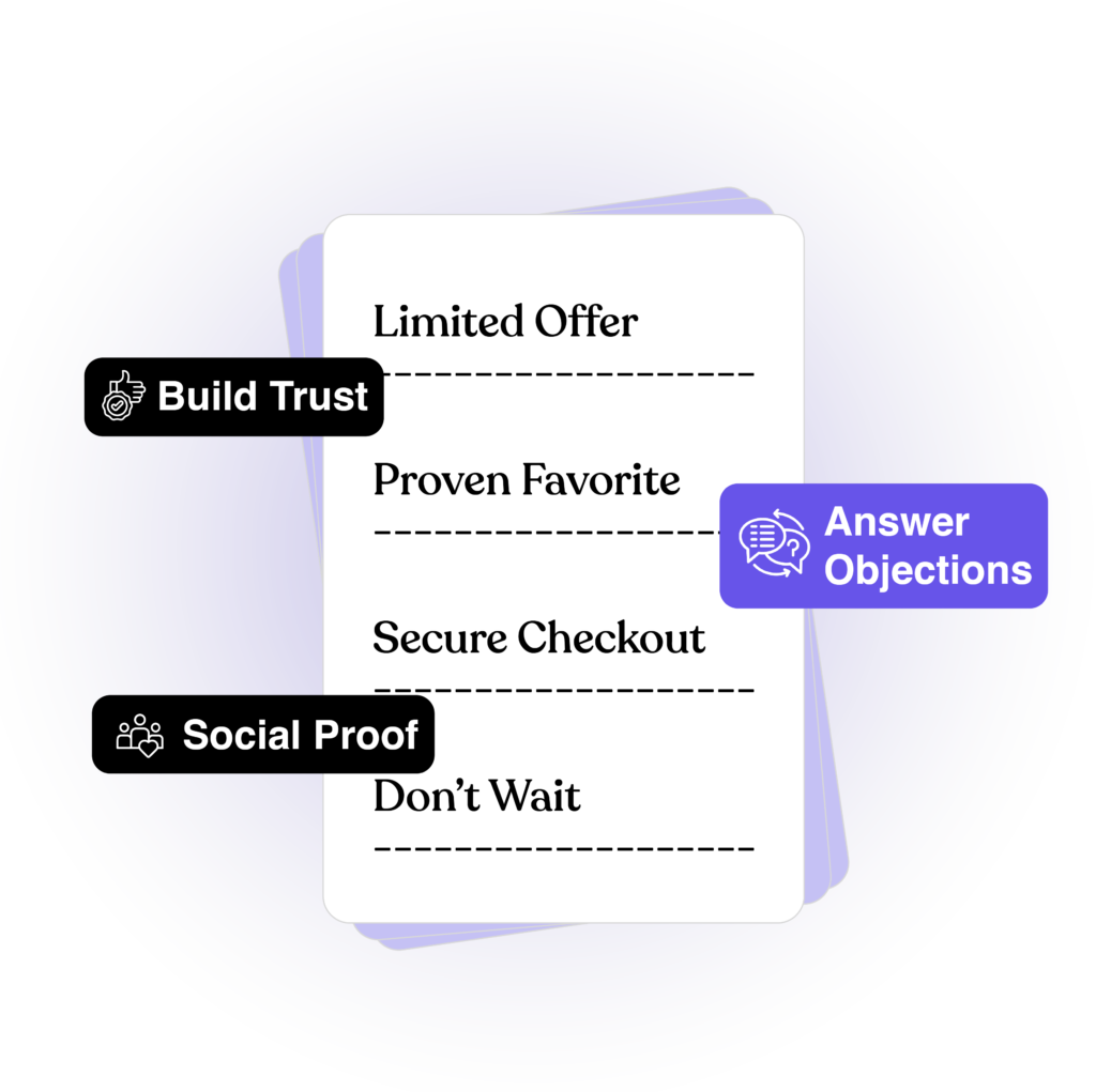 - Value stacking, urgency, guarantees, trust language